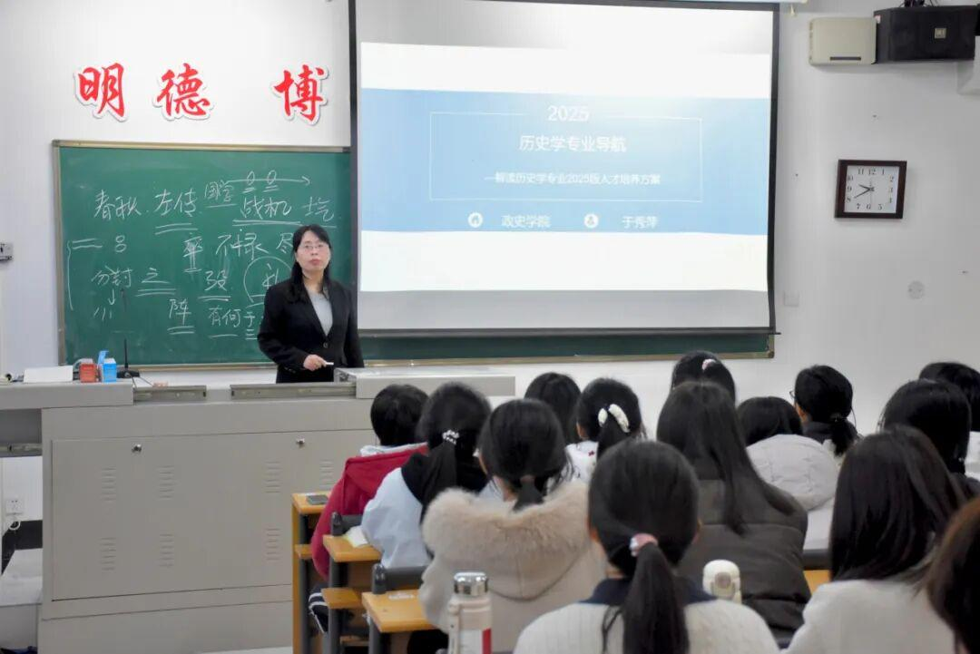 读史明志践履致远 2025级历史学专业导航活动顺利开展 为了帮助2025级历史学专业新生全面了解本专业,激发学习热情,明确大学目标,适应大学生活,政史学院于11月3日上午在齐越楼203教室开展了历史学专业导航活动。本次讲座由历史学专业负责人于秀萍教授主讲,2025级历史学专业全体学生参加。