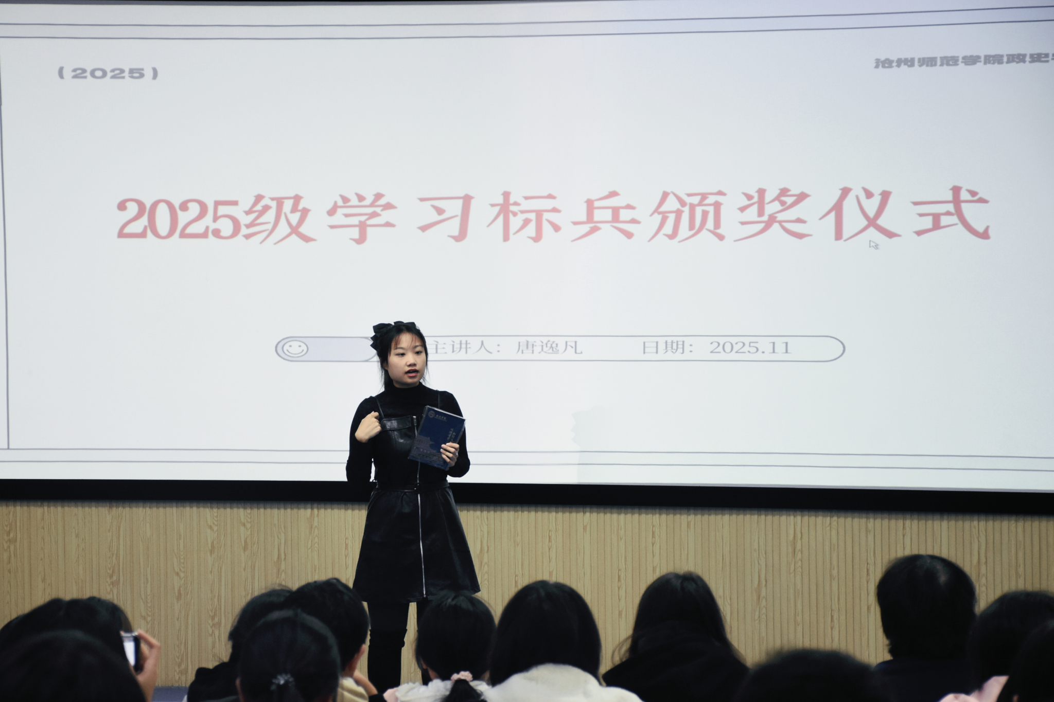 为积极响应学校迎评促建工作,扎实推进学风建设,表彰先进、树立典型,11月8日晚,政史学院于沧兴教学楼文一阶梯教室开展了学习标兵颁奖仪式。本次活动由政史学院辅导员唐逸凡主持,25级全体同学参加。