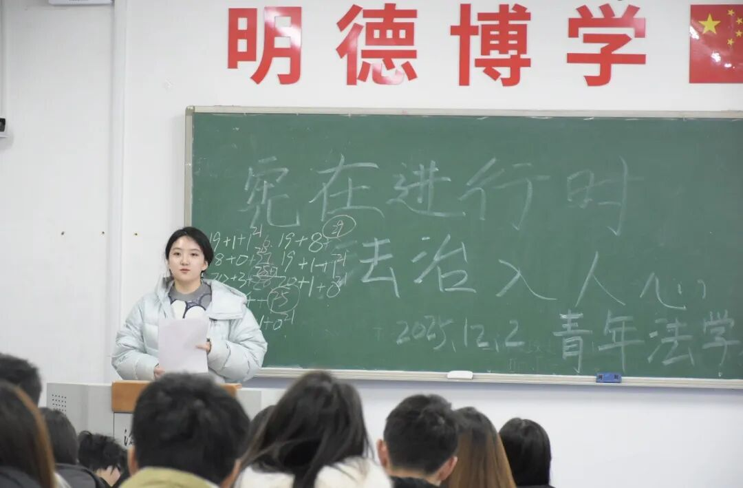 为弘扬宪法精神、增强宪法意识、筑牢法学根 基,12月2日晚,青年法学社在沧兴教学楼11阶梯教室举办“宪在进行时,法治入人心”答题活动。本次活动由青年法学社社长肖奕洁主持,各部门部长以及全体青年法学社成员参加。