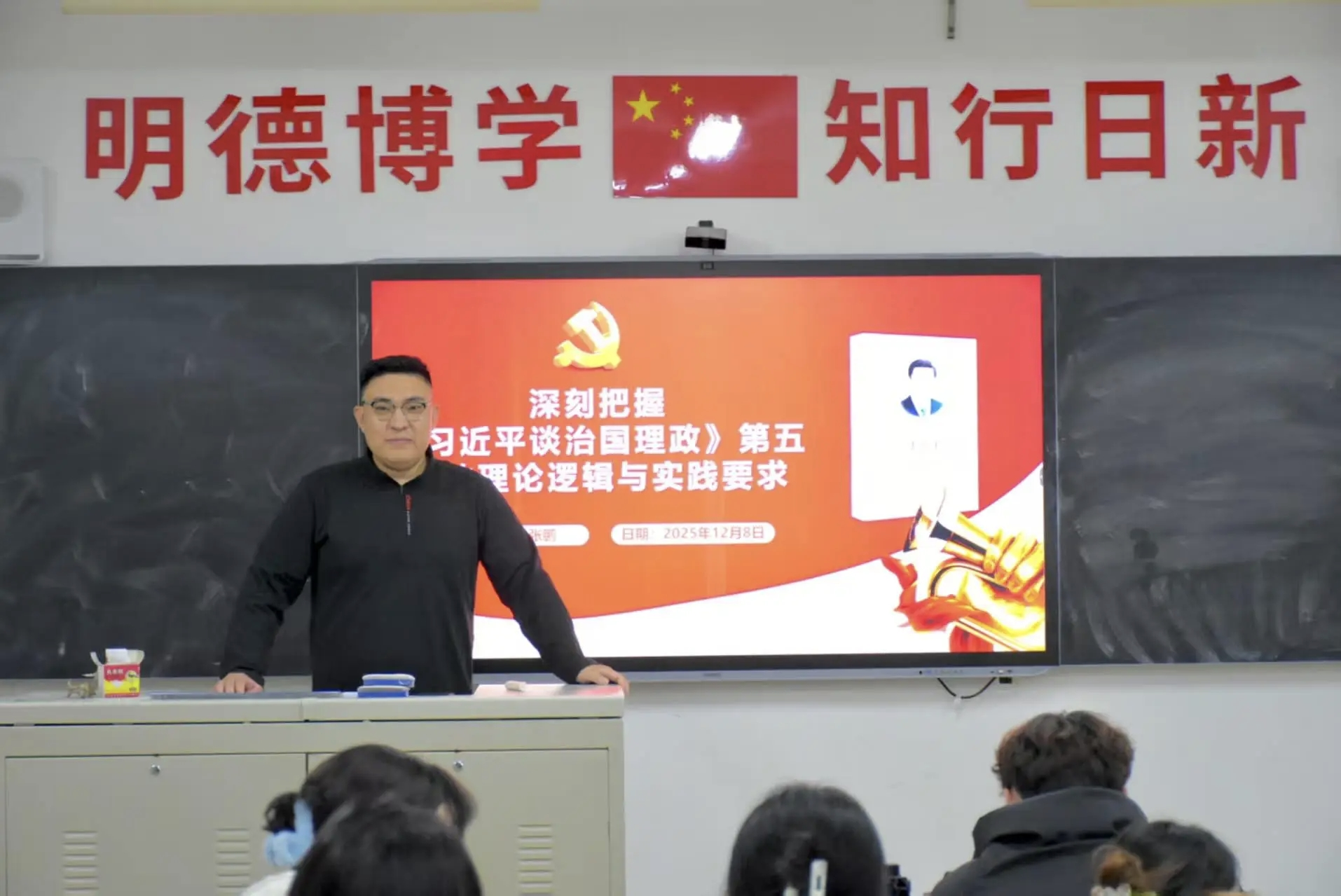 为帮助学生系统把握《习近平谈治国理政》第五卷的理论体系与逻辑脉络、坚定理想信念与历史主动精神、激励其将学习成果转化为担当民族复兴大任的行动自觉,政史学院马克思主义小组于2025年12月8日下午在沧兴教学楼18教开展“深刻把握《习近平谈治国理政》第五卷的理论逻辑与实践要求”主题讲座活动。本次讲座由张鹏老师主讲,全体马克思主义小组成员参加。