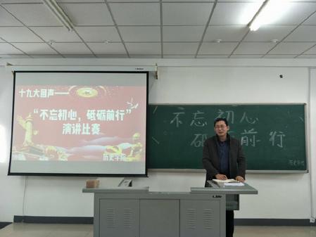 为深入学习贯彻十九大精神,提高学生们思想道德素质,2017年11月30日上午十点,历史学院于文科楼三楼十二阶梯教室举办了“不忘初心 砥砺前行”为主题的演讲比赛。副院长焦以爽,辅导员邓金、胡蔚然、刘明月老师出席活动并担任评委,17级全体学生参加。活动由17历史学刘莉、17历史教育刘亨主持。