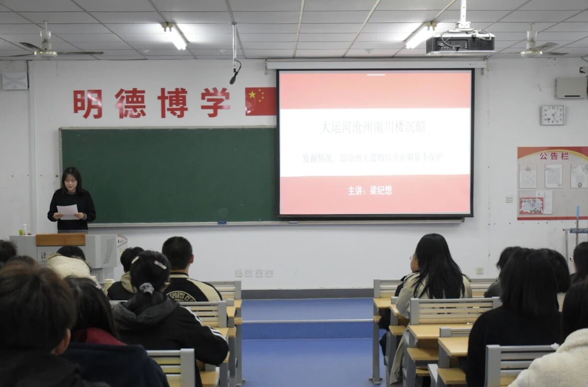 为进一步拓展文博学子专业视野,加深对田野考古实践的理解,10 月 27 日晚,我院特邀河北省考古学会理事梁纪想在沧兴教学楼11 阶开展专题讲座。本次讲座以"沧州南川楼沉船考古挖掘与研究"为主题,文博教研室主任韩梦瑶以及24级、25级文物与博物馆学专业全体同学参加。